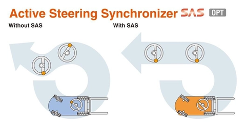 SAS và SAS-E được cấu thành từ nhiều tính năng bảo vệ thông minh, trong đó nổi bật là Active Control Rear Stabilizer – tính năng ổn định bánh sau nhằm ngăn ngừa tình trạng lật xe khi xe quay gấp hoặc chở hàng nặng. Swing Lock Cylinder giữ chặt cột nâng khi không hoạt động, giảm rung lắc và tăng tuổi thọ máy. Tính năng Active Steering Synchronizer giúp đồng bộ hóa vô-lăng với bánh lái, tăng độ chính xác khi điều khiển trong không gian hẹp. Đặc biệt, bộ Active Mast Tilt Control và Automatic Fork Leveling giúp kiểm soát độ nghiêng, tự động cân bằng càng nâng, đảm bảo hàng hóa luôn ổn định khi nâng hạ. Tùy theo phiên bản SAS-B, SAS-C hay SAS-F mà số lượng tính năng sẽ khác nhau. Tuy nhiên, điểm chung là tất cả đều giúp xe vận hành an toàn hơn mà không yêu cầu kỹ năng đặc biệt từ người sử dụng – giúp nâng cao năng suất lao động một cách toàn diện.